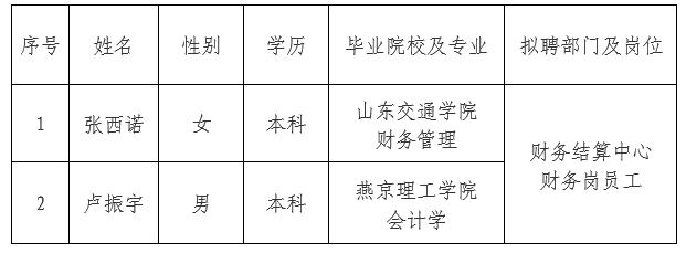 依據出資人代表機構審批意見,承德市國控投資集團有限責任公司委托第三方機構面向社會公開招聘財務崗員工2人。現對擬錄用人員信息進行公示,公示期間如有異議,可通過電話、信函等方式反映,反映意見請署真實姓名。