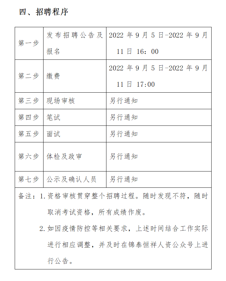?2022年9月5日-2022年9月11日16:00 在錦泰恒祥人資官網(wǎng)(www.jthxhr.com)、“錦泰恒祥人力資源服務(wù)有限公司”微信公眾號、“國控集團”官方網(wǎng)站(www.bangweiwang.com)及上級部門要求的相關(guān)網(wǎng)站等發(fā)布招聘公告。