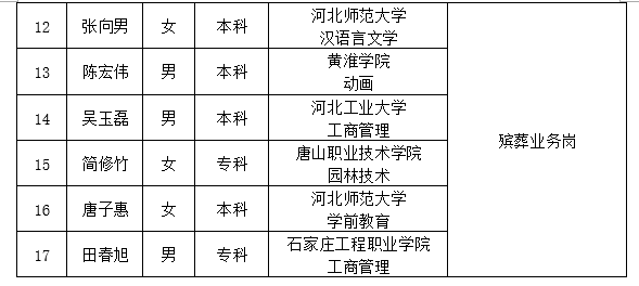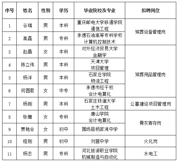 因公司發(fā)展需要,承德市國瑞置業(yè)有限公司委托第三方機構(gòu)面向社會公開招聘殯儀館運營各崗位人員17名?,F(xiàn)對擬錄用人員信息進行公示,公示期間如有異議,可通過電話、信函等方式反映,反映意見請署真實姓名。