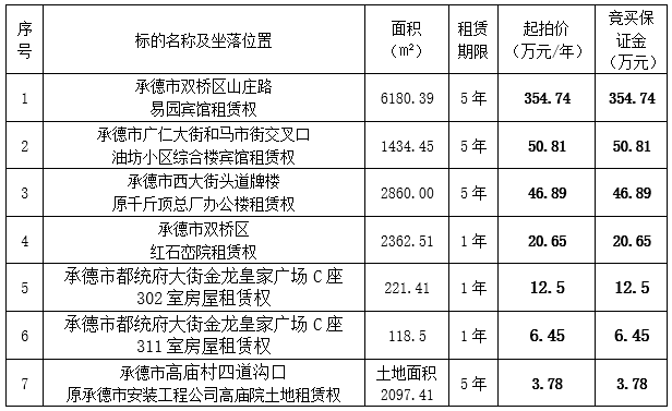 我集團全資子公司承德市國控資產(chǎn)運營有限公司、承德市國瑞物業(yè)管理有限公司委托河北福成拍賣有限公司,定于2020年1月21日上午9時在承德市雙橋區(qū)武烈路6號紫御國際假日酒店會議室公開拍賣下列標的,現(xiàn)將有關事項公告如下: